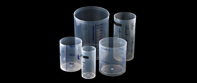 Tubos dosificadores de PP con diferentes diámetros y capacidades. Capacidad mínima. 2,5 ml. Capacidad máxima: 1.500 ml.